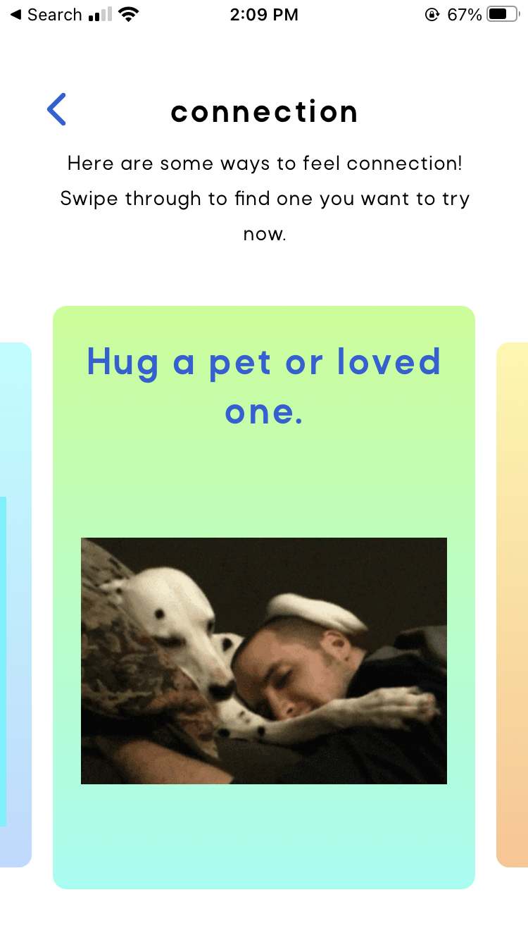 Kids choose an option of what they want to try first — to connect with someone? To get their feelings out? Or perhaps to laugh and be silly for a bit? Then, they swipe through funny gifs to show them examples of what healthy coping skills look like and what they can try to help them next time they are feeling this way.