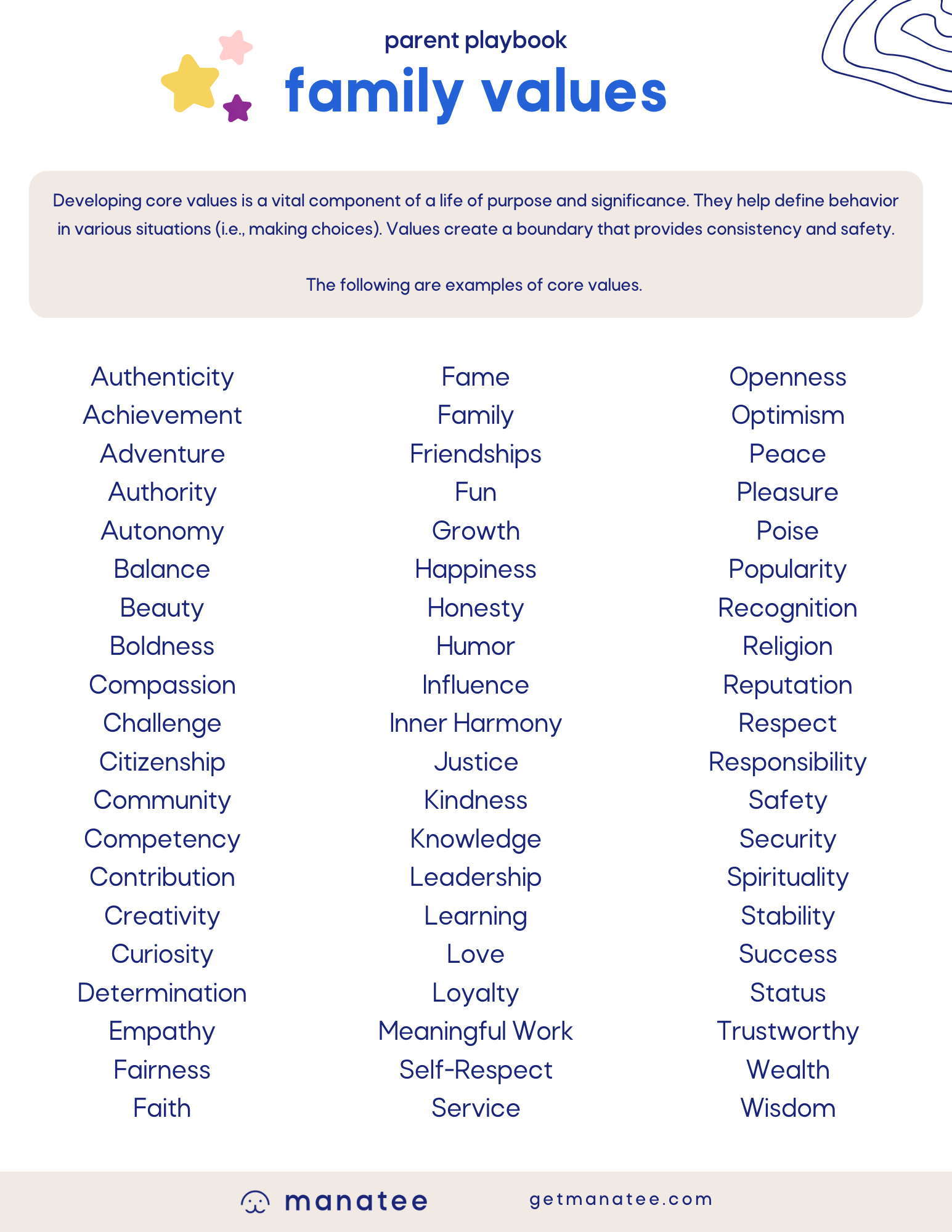 Family values are the principles and beliefs that guide your family. Aligning on your values as a family creates a shared sense of purpose that helps guide family decisions, rules, boundaries, and conflict resolution.